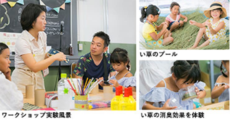 今の親世代ですら、家に畳の部屋がなく、なかなか畳やゴザなどのい草に触れる機会がないという現状を解決するために、ワークショップコレクションに出展し、たくさんの子どもたち、保護者たちにい草の良さを再確認して、い草製品に接触してもらう機会を作り出しました。2016年開催では「い草のプール」を設置し、い草のさわやかな香りや気持ちよさを体感させ、2017年では、い草に消臭効果があることを「い草の消臭実験」という形で体感させ、日本古来から使用されているい草製品の良さを伝えることができました。
