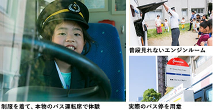 日本国内で最大数のバスを保有する九州最大手の交通企業である西日本鉄道様は、2017年のワークショップコレクションでは、本物の路線バスを展示しました。電光掲示板やバス停も実際のものを使い、イベントの開催時間を実際の時刻表そっくりに作るなど、本格的なワークショップとなりました。普段何気なく乗っているバスが行っている環境保護のための対策や、バスについて知識を深めてもらうためのクイズをワークショップとして実施。制服を着て運転席に座ったり、普段は絶対に見れないエンジンルーム内部を見学したりと、西鉄バスのイメージアップにつながりました。
