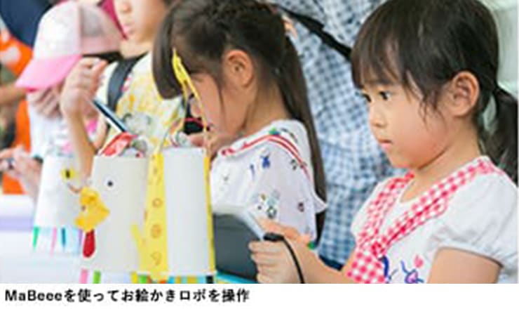 IOTで動く電池カバー「MaBeee」認知度向上のため、紙コップとモーターで動く、お絵かきロボのワークショップとコラボ。スマホで動く手作りのロボと、いい形で化学反応を起こしました。パンフレットを手にとって「どこで売ってるの?」というお問い合わせが多数。